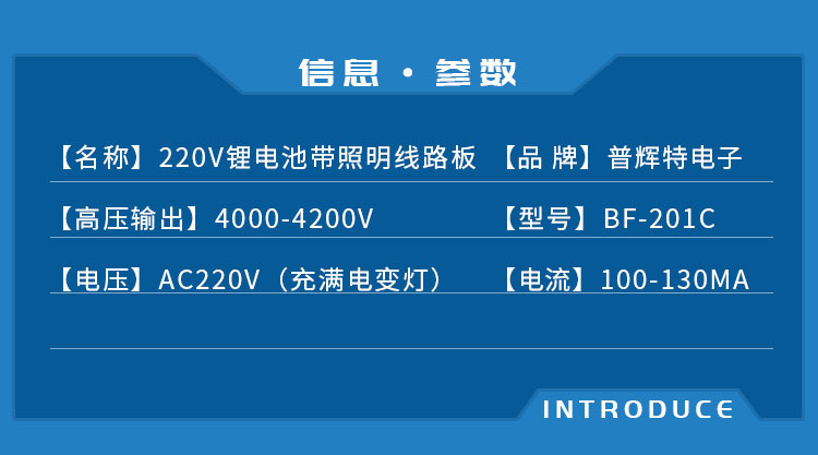 输出电压为4000V-4200V 充电电压:220V 电流:100-130mA 特点:充满电变灯