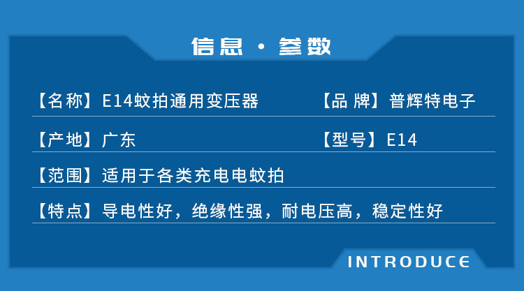 特点:导电性好,绝缘性强,耐电压高,稳定性好;适用于各类充电电蚊拍