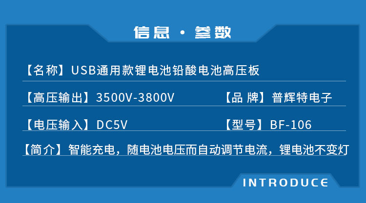 电压输入:DC5V 高压输出:3500V-3800V 特点:智能充电,随电池电压而自动调节电流,锂电池不变灯
