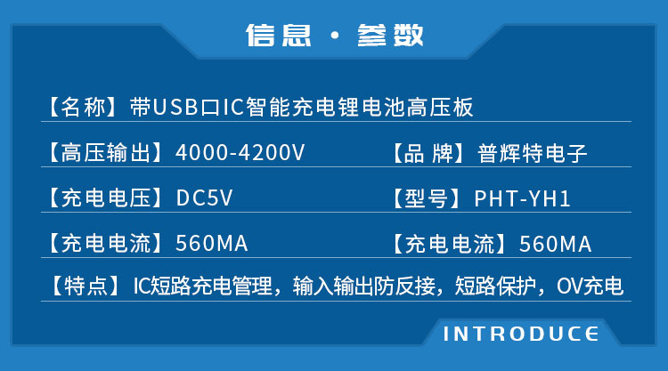 充电电流:560mA,充电电压:DC5V 输出高压:4000-4200V IC短路充电管理,输入输出防反接,短路保护,OV充电