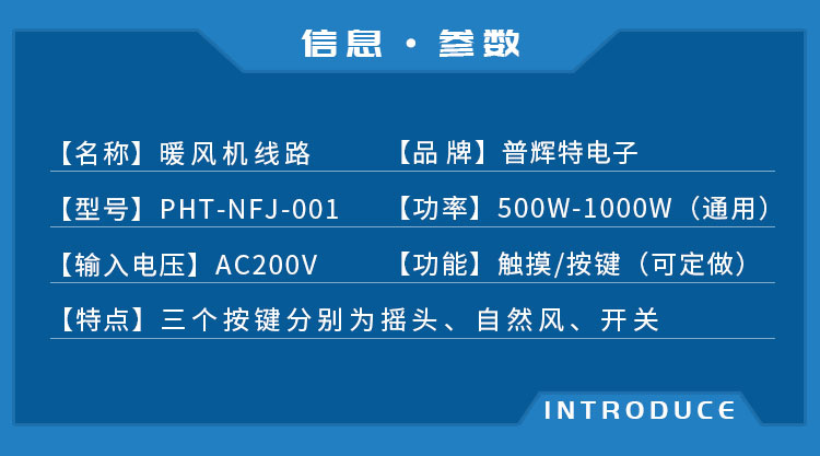 触摸/按键; 功率:500W-1000W通用; 输入电压为AC200V; 三个按键分别为摇头、自然风、开关; 功能可定制