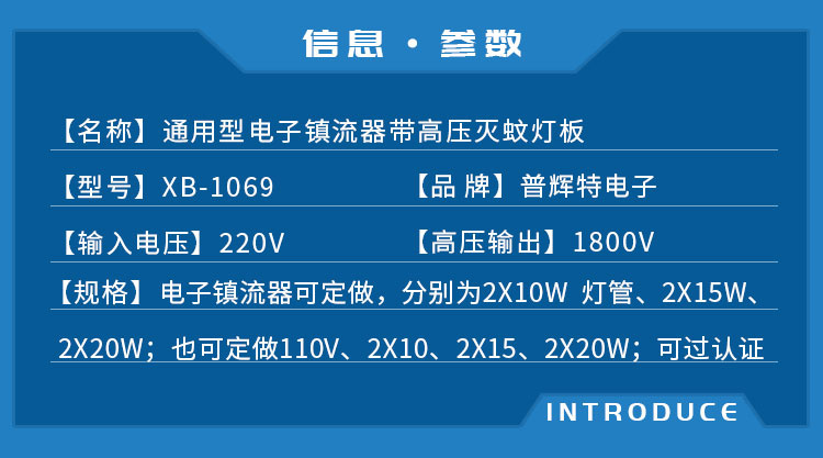 电压输入(AC):220V;高压输出:1800V 电子镇流器可定做,分别为 2X10W 灯管 2X15W 2X20W 也可定做110V、2X10、2X15、2X20W 可过认证