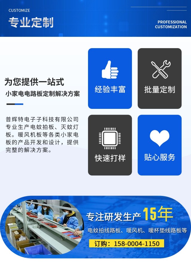 佛山市顺德区普辉特电子科技有限公司专业生产电蚊拍板.灭蚊灯板。暖风机板等各类小家电板的产品开发和设计,提供完整的解决方案。在质量上和交期上更有保障,公司以设计领先,功能齐全产品性能稳定,包装,出货等各个环节都有着严格的程序来控制把关,从而确保为顾客提供高质量、高效率的产品。